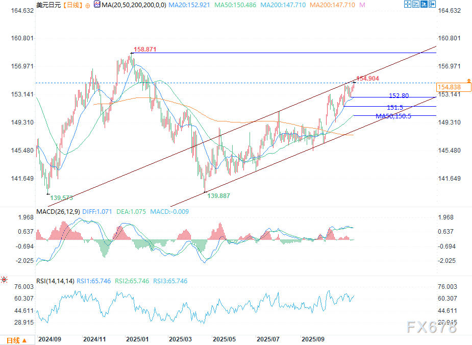 综上,美元/日元上涨反映了政策分化,以及市场对美元持续走强的信心。尽管技术指标偏向多头,但超买状态仍需保持谨慎。