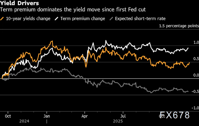 另一派观点则从所谓“期限溢价”中解读出更严峻的信号——这个衡量投资者持有长期债券所要求额外收益的指标,在降息周期开启后已攀升近整整一个百分点。纽约联储数据显示,该溢价补偿的是未来潜在风险,例如持续高企的通胀或不可持续的联邦债务负担。