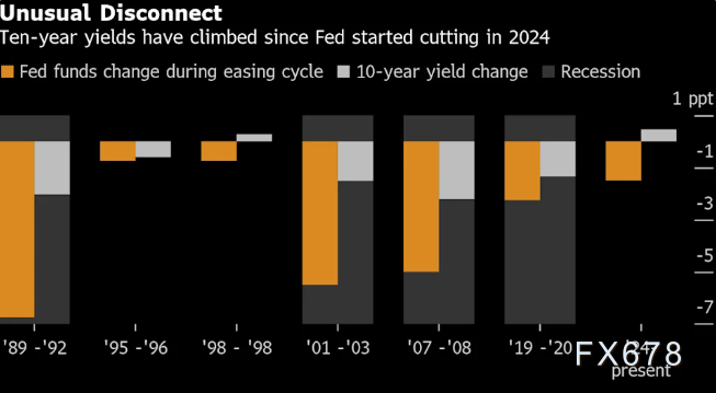 通常情况下,当美联储调整短期政策利率时,长期债券收益率往往同向变动。即使回顾过去四十年中仅有的两次非衰退期降息周期(1995年与1998年,当时美联储每次仅降息75个基点),十年期收益率要么直接下行,要么涨幅远低于当前周期。