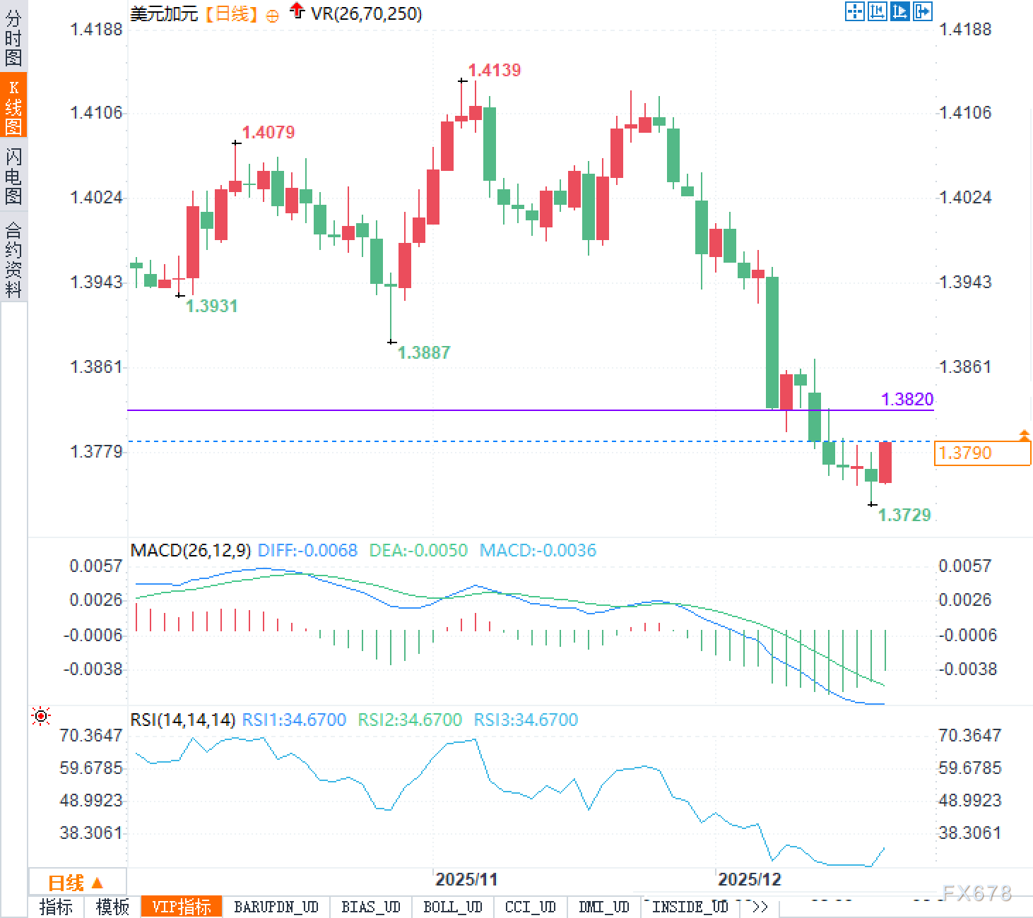 日线图显示汇价此前从1.41附近高位回落,近期下破并回踩过1.3820一带的关键参考区域,目前运行在其下方。动能指标方面,MACD处于零轴下方且柱体偏弱,反映下行趋势仍占主导;RSI在30多附近徘徊,说明短线抛压释放较充分,但并不自动意味着趋势反转,更像是进入“下跌后修复、修复后再选择方向”的整理状态。最近的低点在1.3729附近出现过下影线,结合现价1.3790,可以把当前理解为低位的情绪性修复与技术性回补并存。