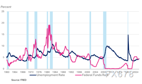 过去45年的经济数据显示,联邦基金利率峰值与失业率谷底始终同步出现,形成“低失业→加息→衰退”的固定循环。