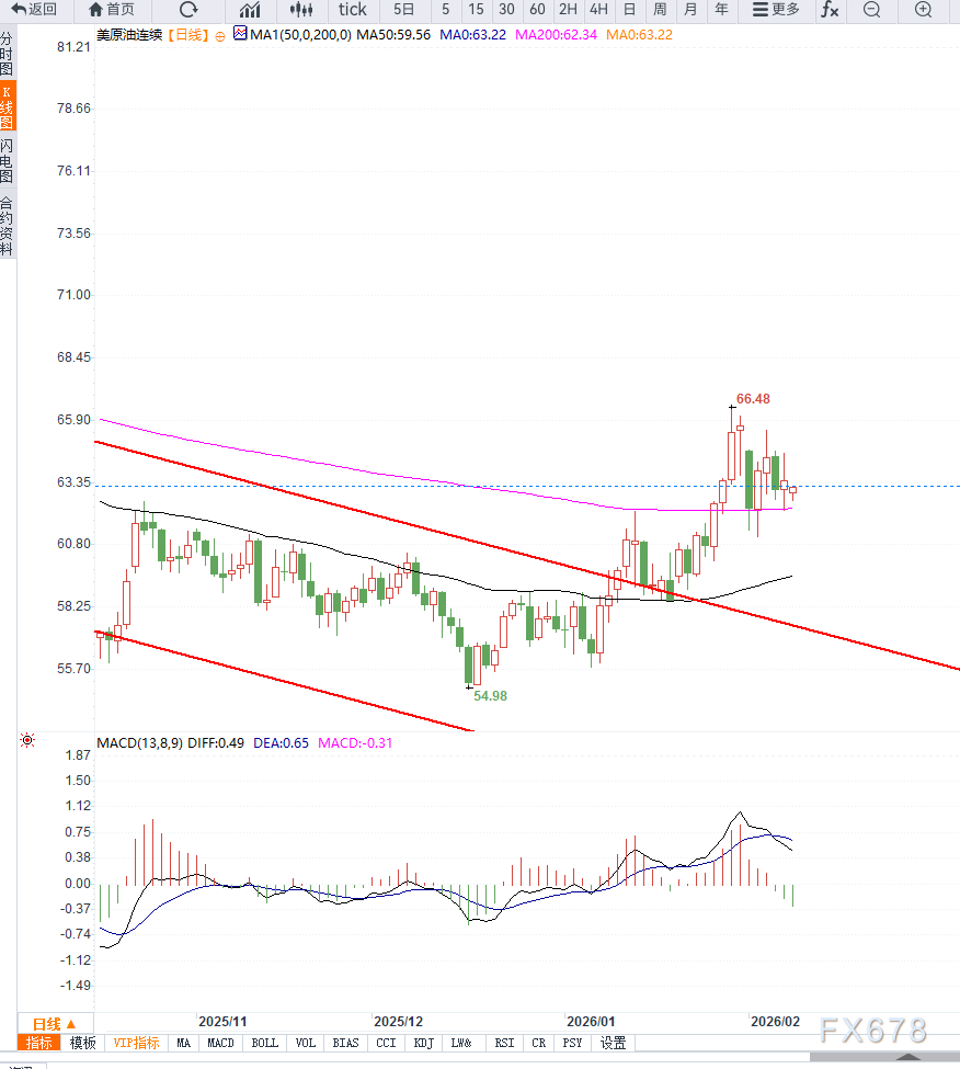 下方支撑方面,63.00美元构成第一关键支撑位,该位置为近期多次收盘密集区,同时也是短期多空分水岭。若该位置失守,第二支撑位关注62.00—62.20美元区间,该区域对应前期回调低点,一旦有效跌破,可能加速下行,打开进一步回落空间。